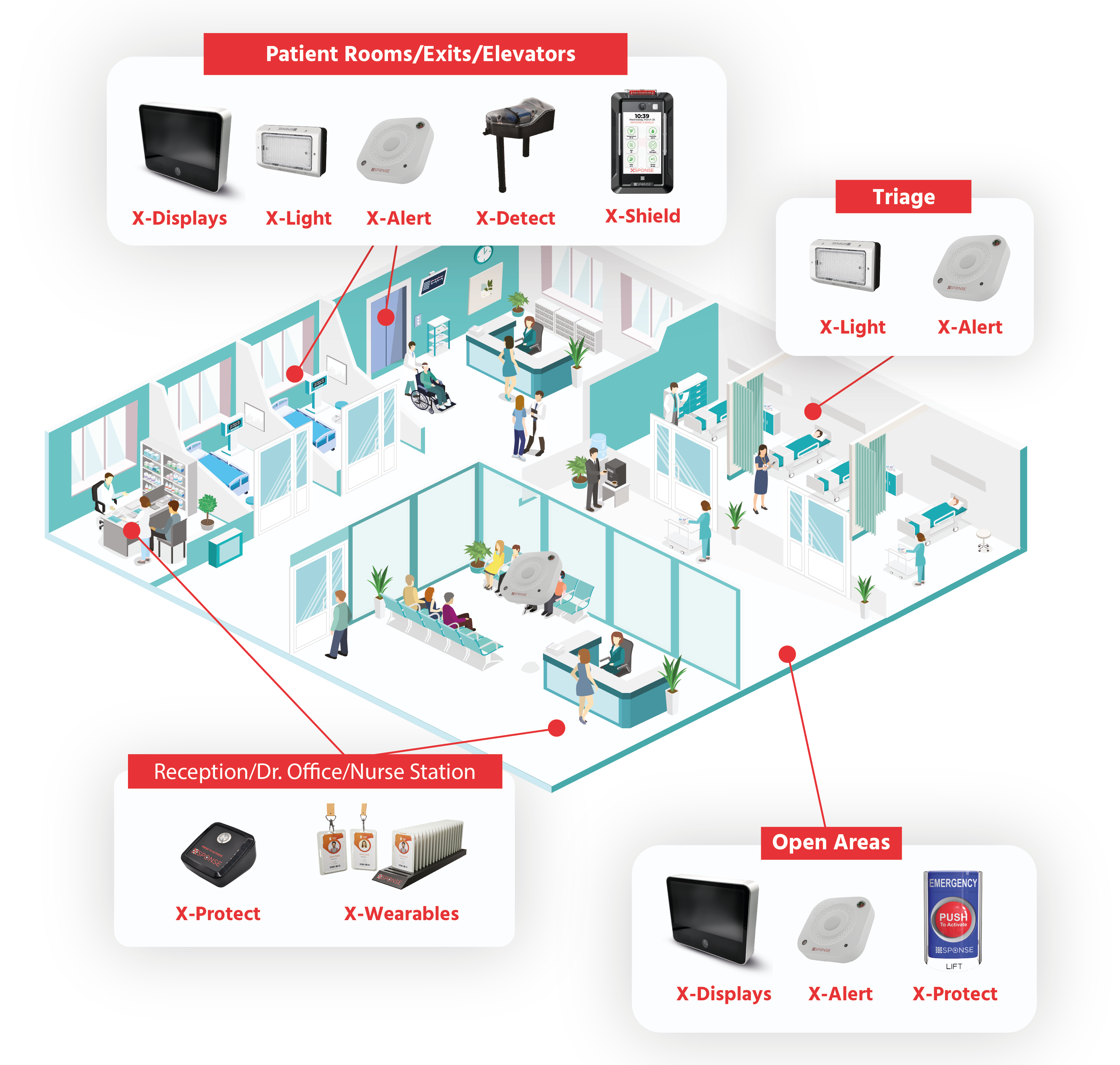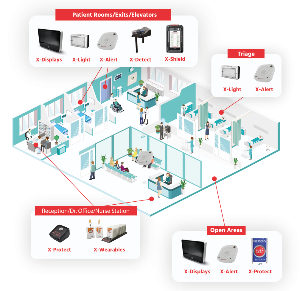 In healthcare settings, the safety of both staff and patients is paramount. XSponse provides advanced security solutions that enhance emergency preparedness and streamline response efforts. The X-Alert system monitors hazards and threats, while the X-Detect device ensures optimal air quality, helping healthcare facilities maintain a safe and healthy environment. Our integrated communication tools like X-Display and X-Protect Panic Buttons enable immediate alerts and efficient notifications, empowering healthcare professionals to respond swiftly to incidents, thereby safeguarding the most vulnerable individuals. Additionally, the inclusion of wearables allows nurses and staff to call for help in an emergency, facilitating real-time communication and ensuring that assistance is promptly dispatched when needed.